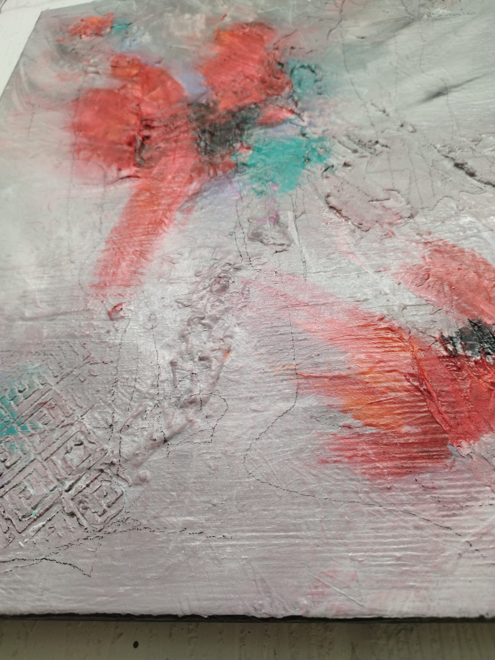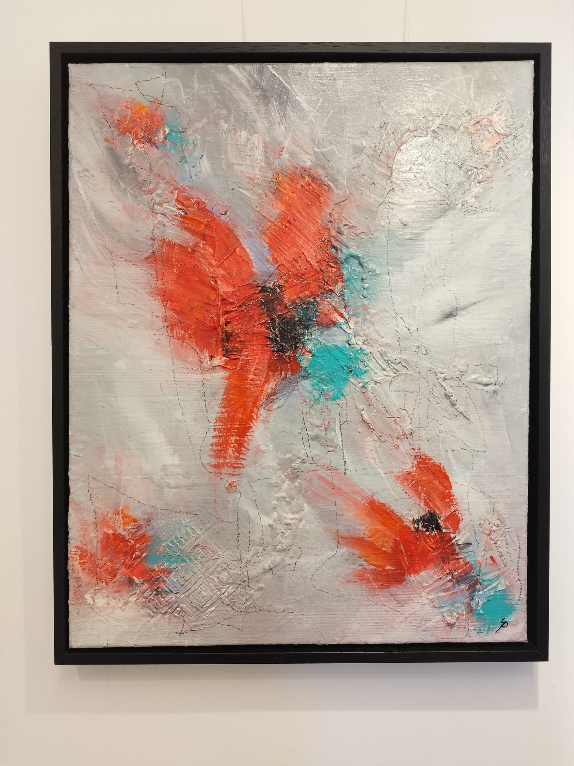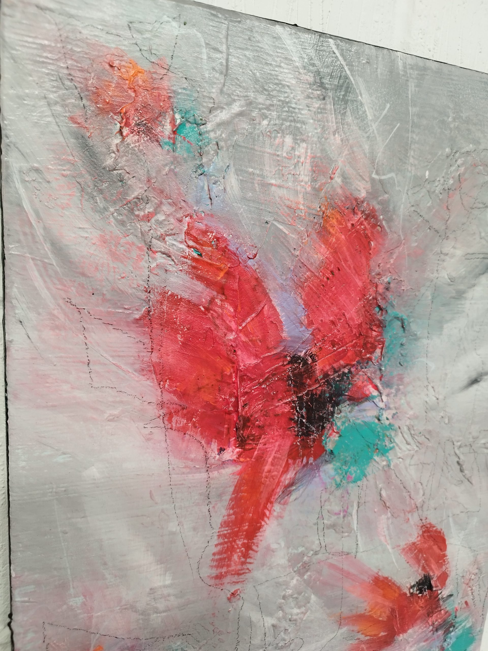A captivating composition with several focal points, defined by the bird-like shapes, and plenty of “negative” grey space to off-set the bright reds. The title came from the shapes and brush strokes suggesting flight, soaring, landing – birds make it all look effortless. Having said that, watching swans lift off, in Pittville park (in Cheltenham), is really not effortless. 😊