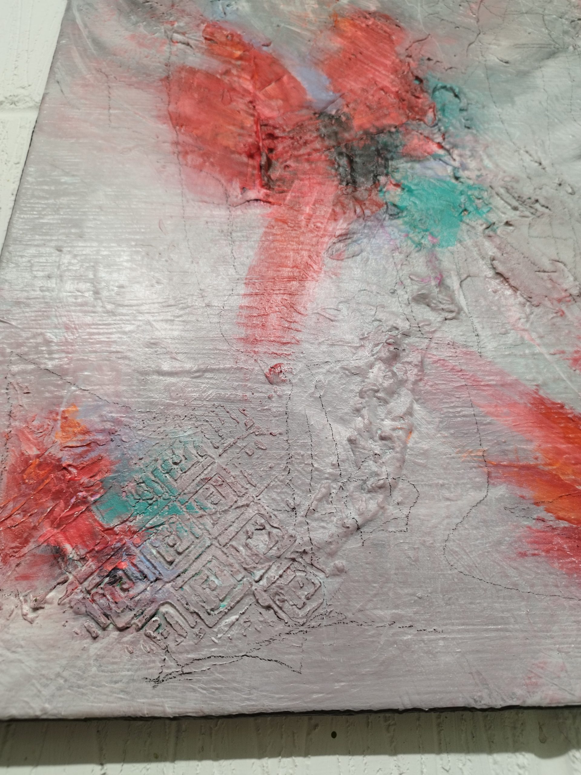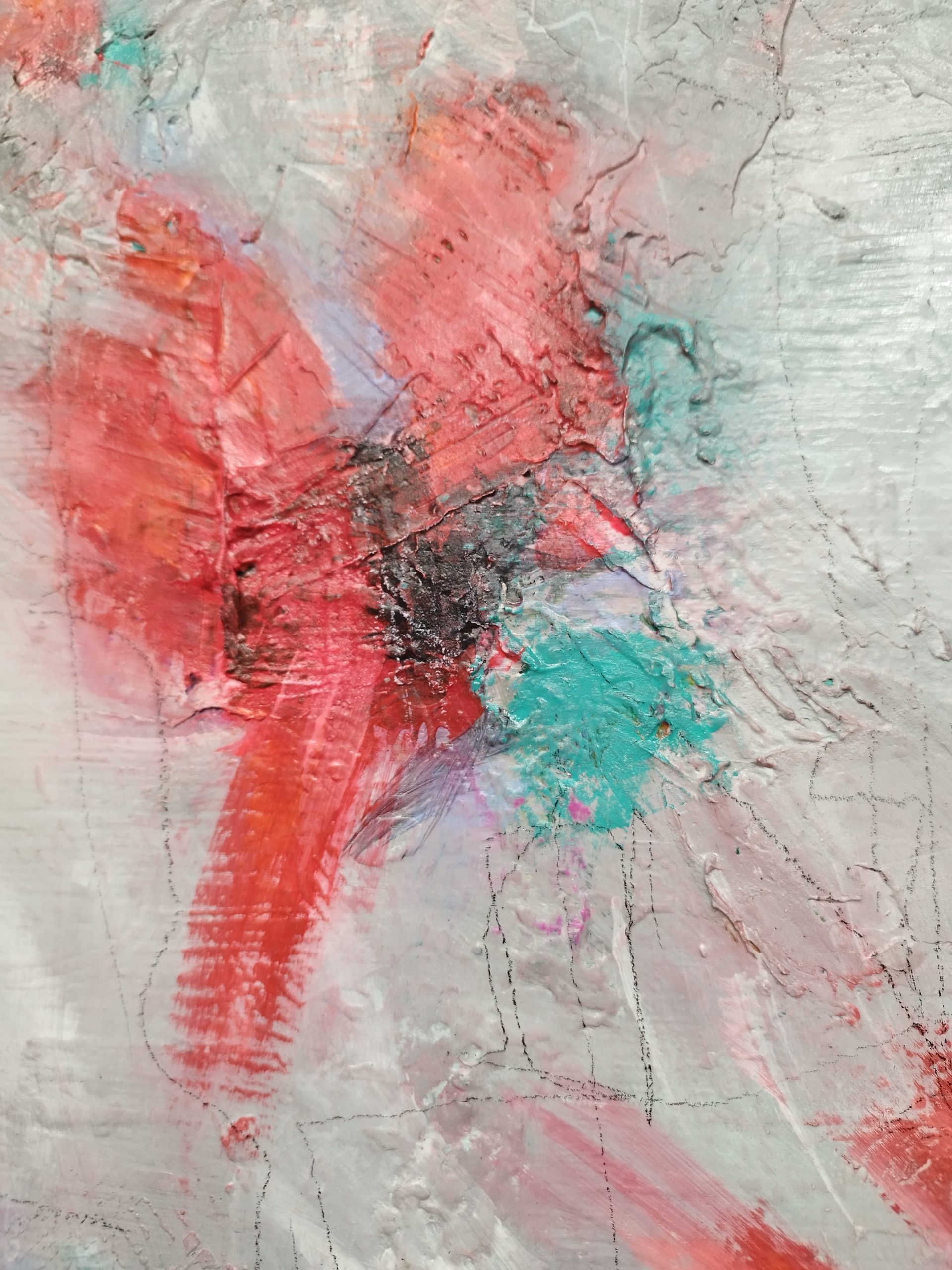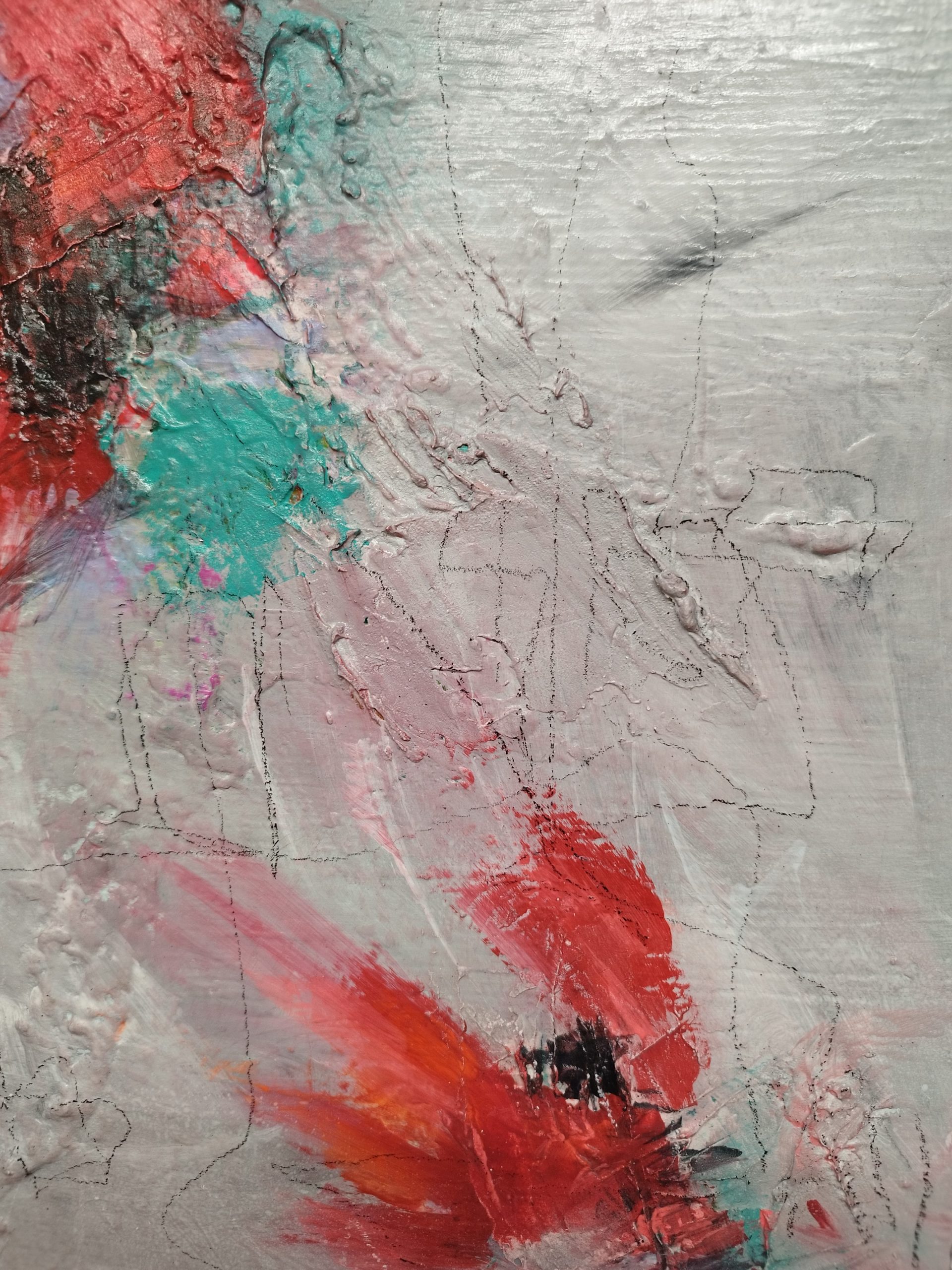 A captivating composition with several focal points, defined by the bird-like shapes, and plenty of “negative” grey space to off-set the bright reds. The title came from the shapes and brush strokes suggesting flight, soaring, landing – birds make it all look effortless. Having said that, watching swans lift off, in Pittville park (in Cheltenham), is really not effortless. 😊