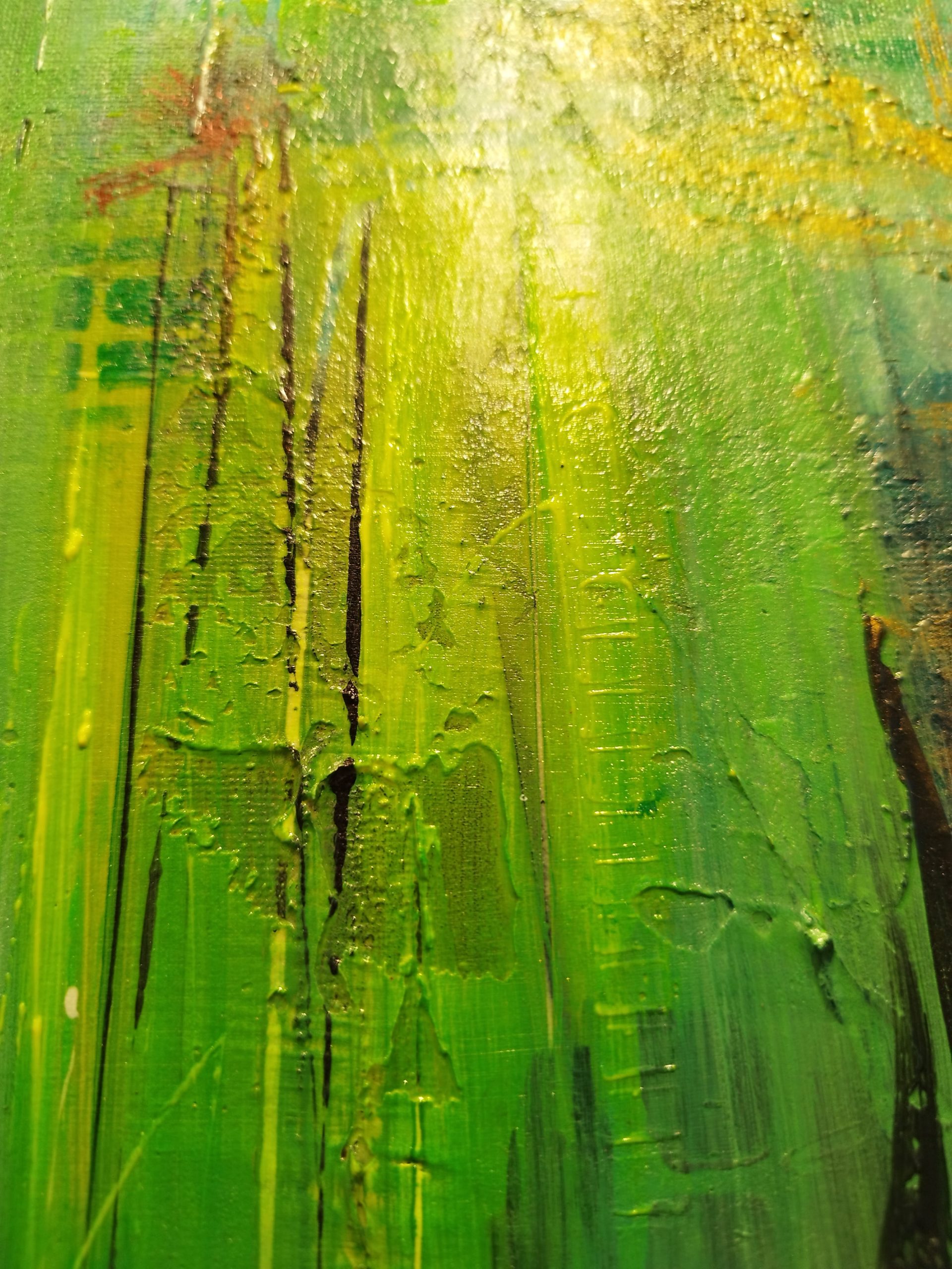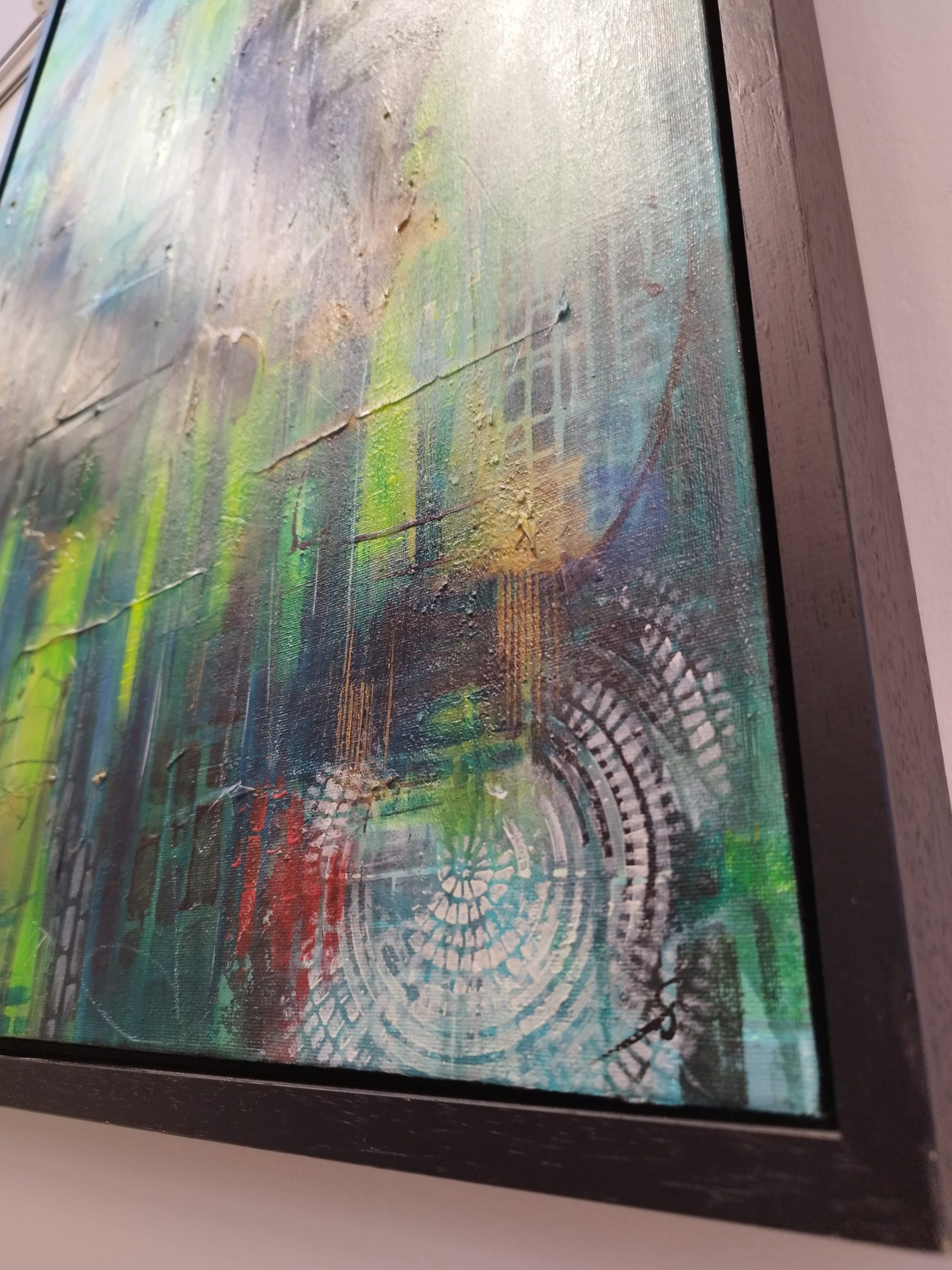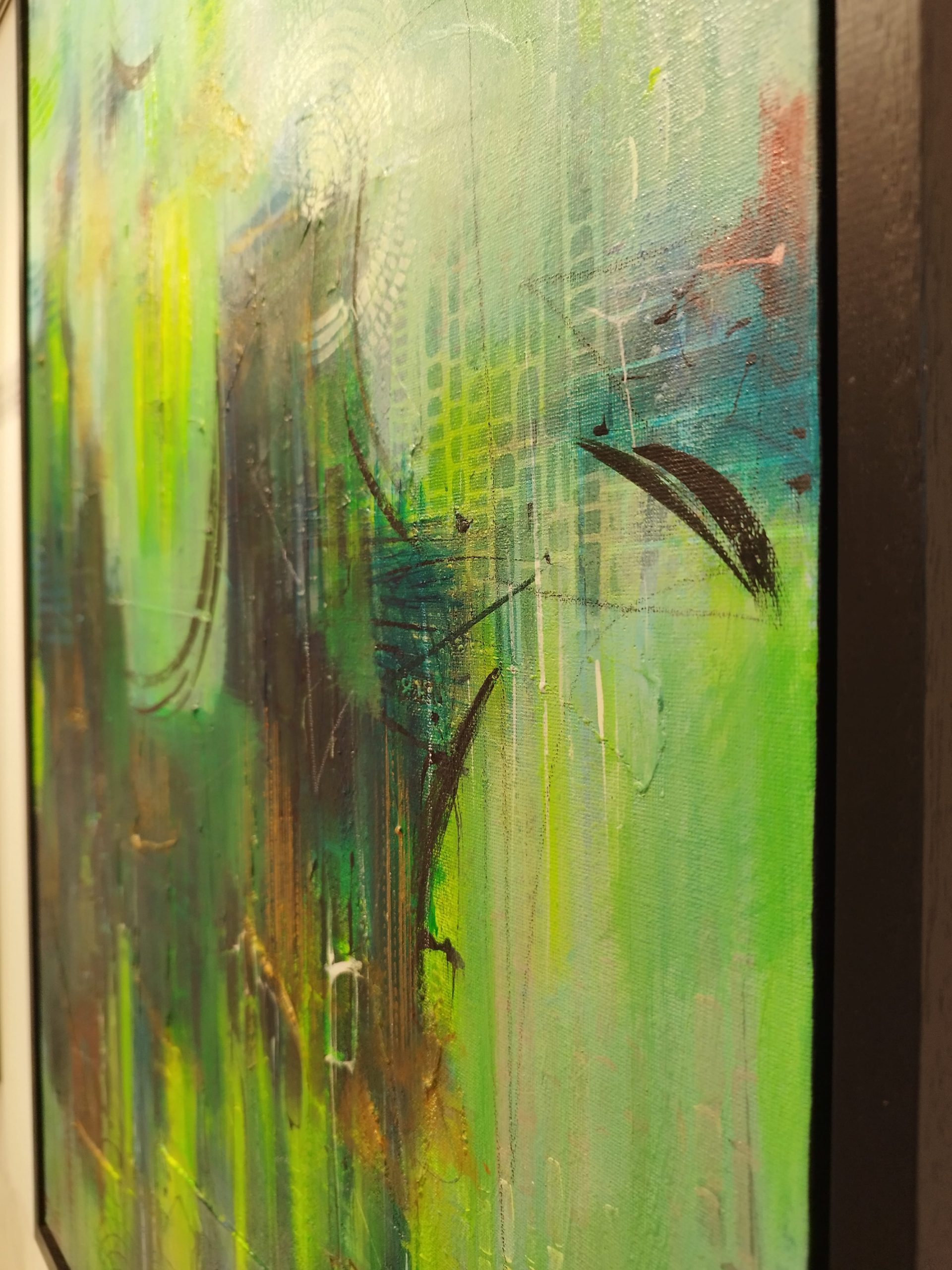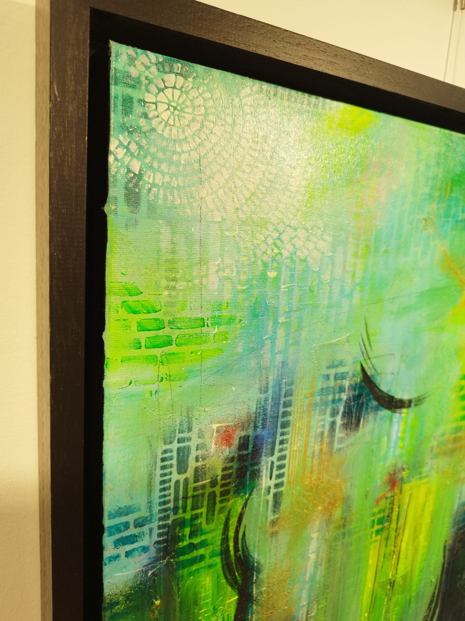 This piece is about the power of dreams – the way scenes shift and change, the intense real-life-like emotions, the presence of people we feel without seeing any faces. The contrast really makes this canvas alive, as the eye registers dark and light shapes in the multiple paint layers. I love all my artworks, but some are harder to let go of – this is one of them.