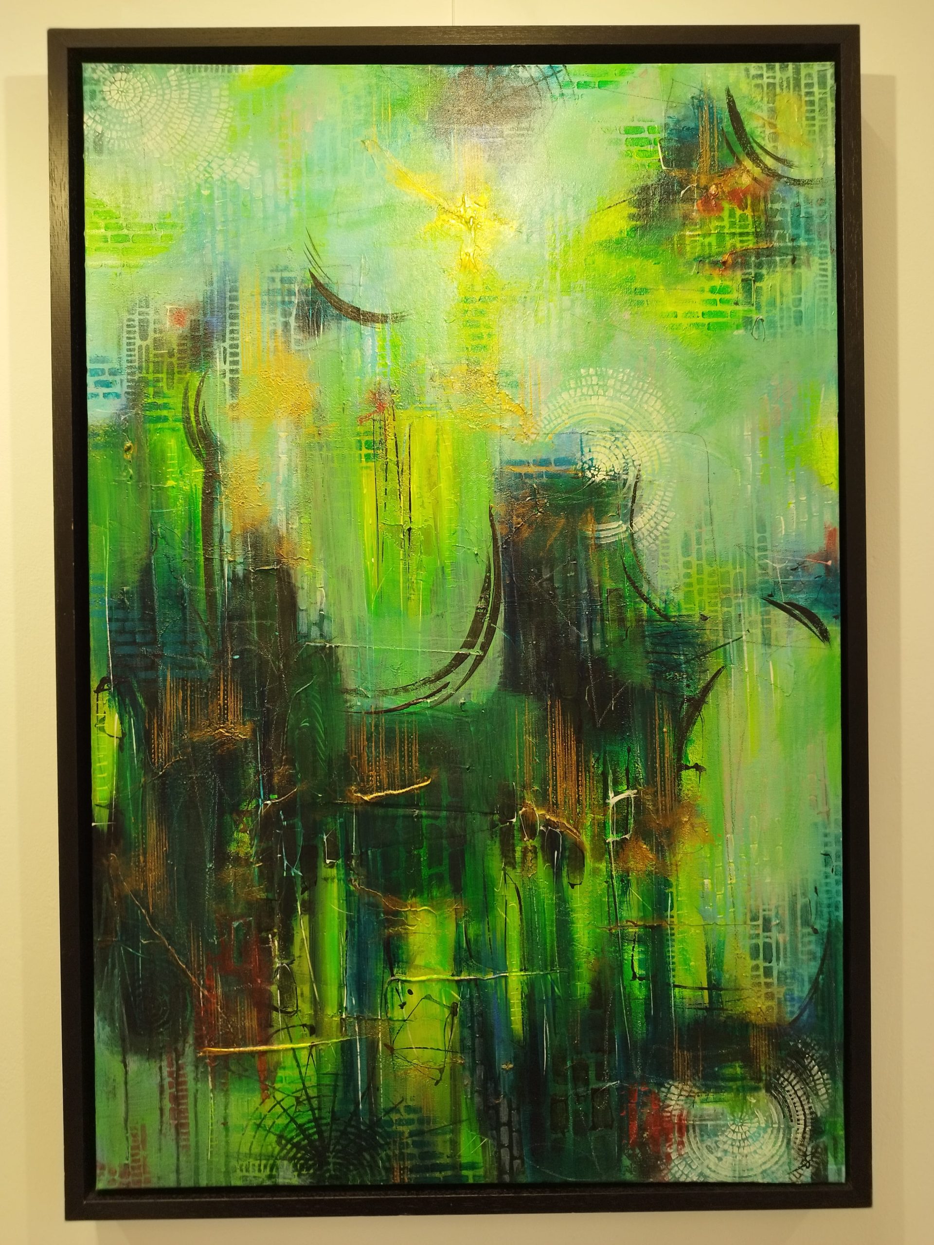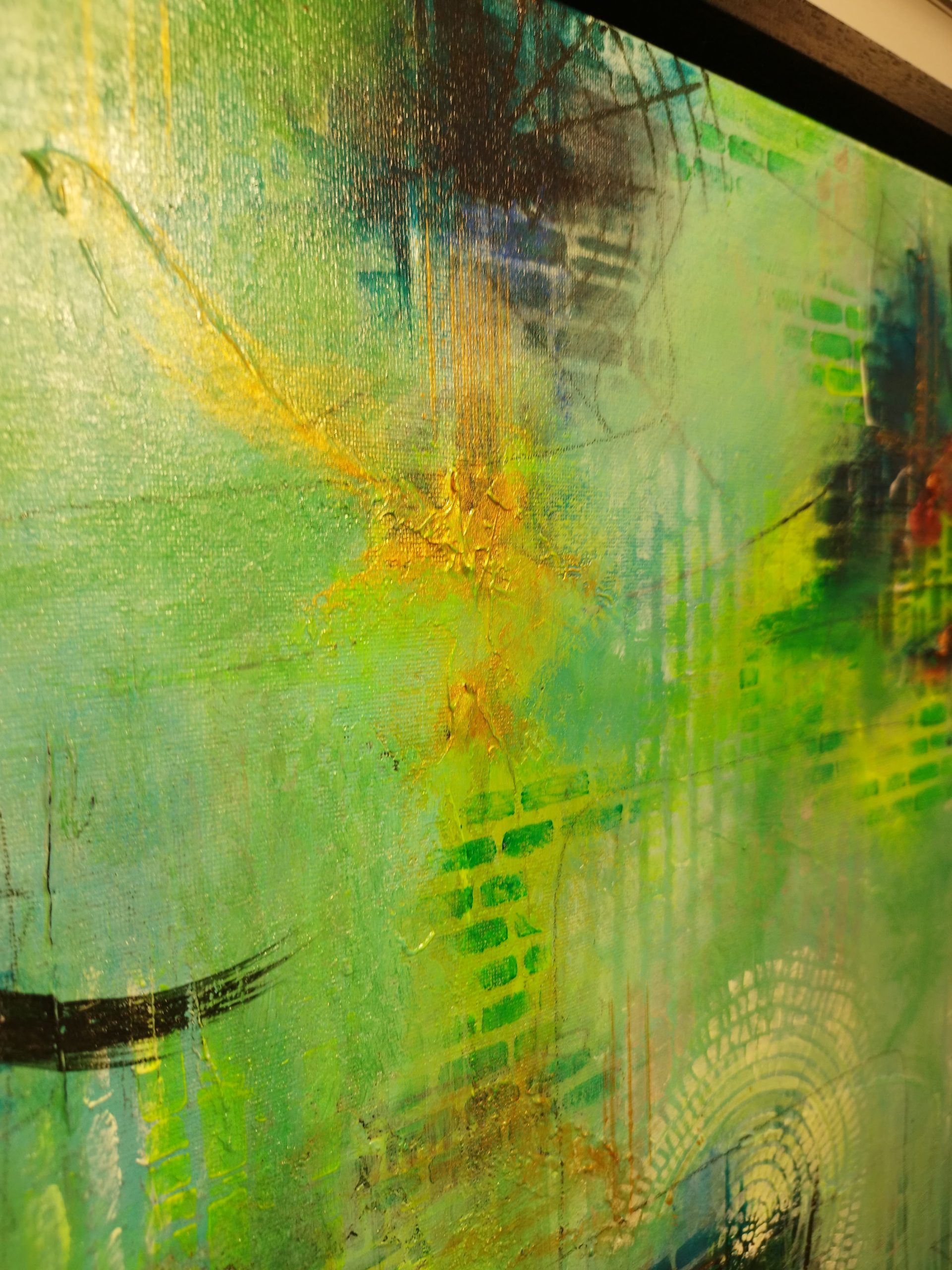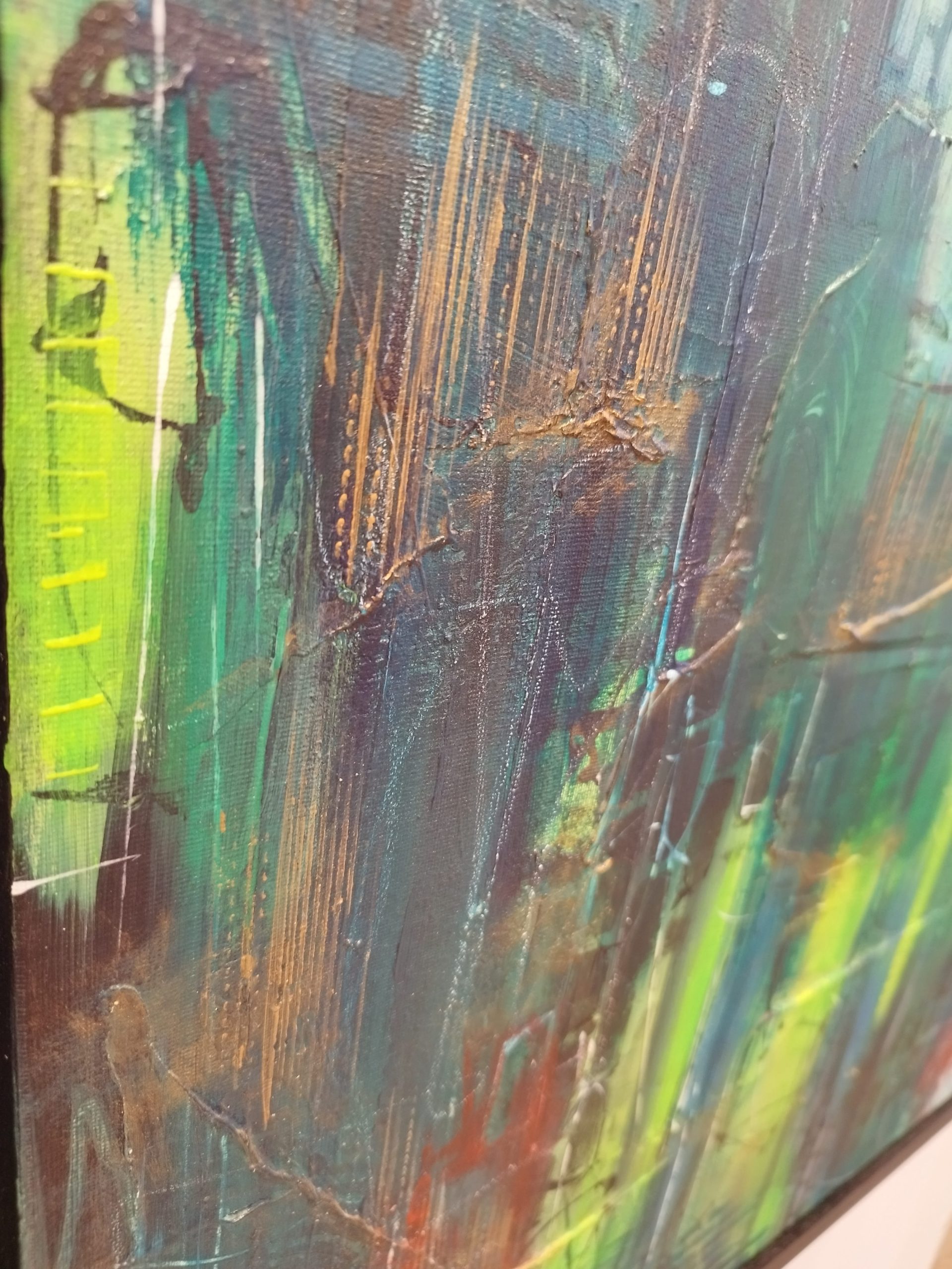 This piece is about the power of dreams – the way scenes shift and change, the intense real-life-like emotions, the presence of people we feel without seeing any faces. The contrast really makes this canvas alive, as the eye registers dark and light shapes in the multiple paint layers. I love all my artworks, but some are harder to let go of – this is one of them.