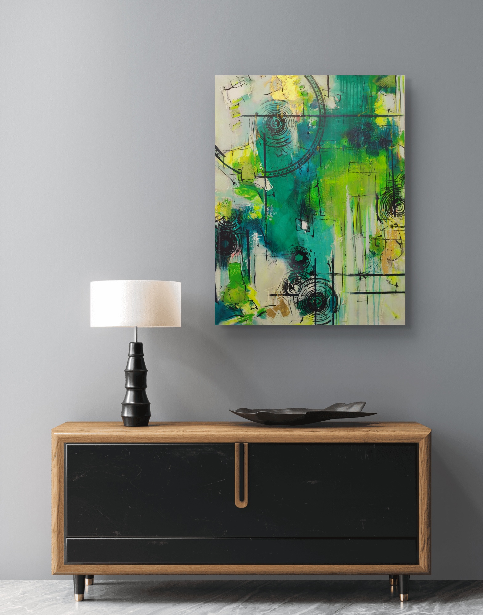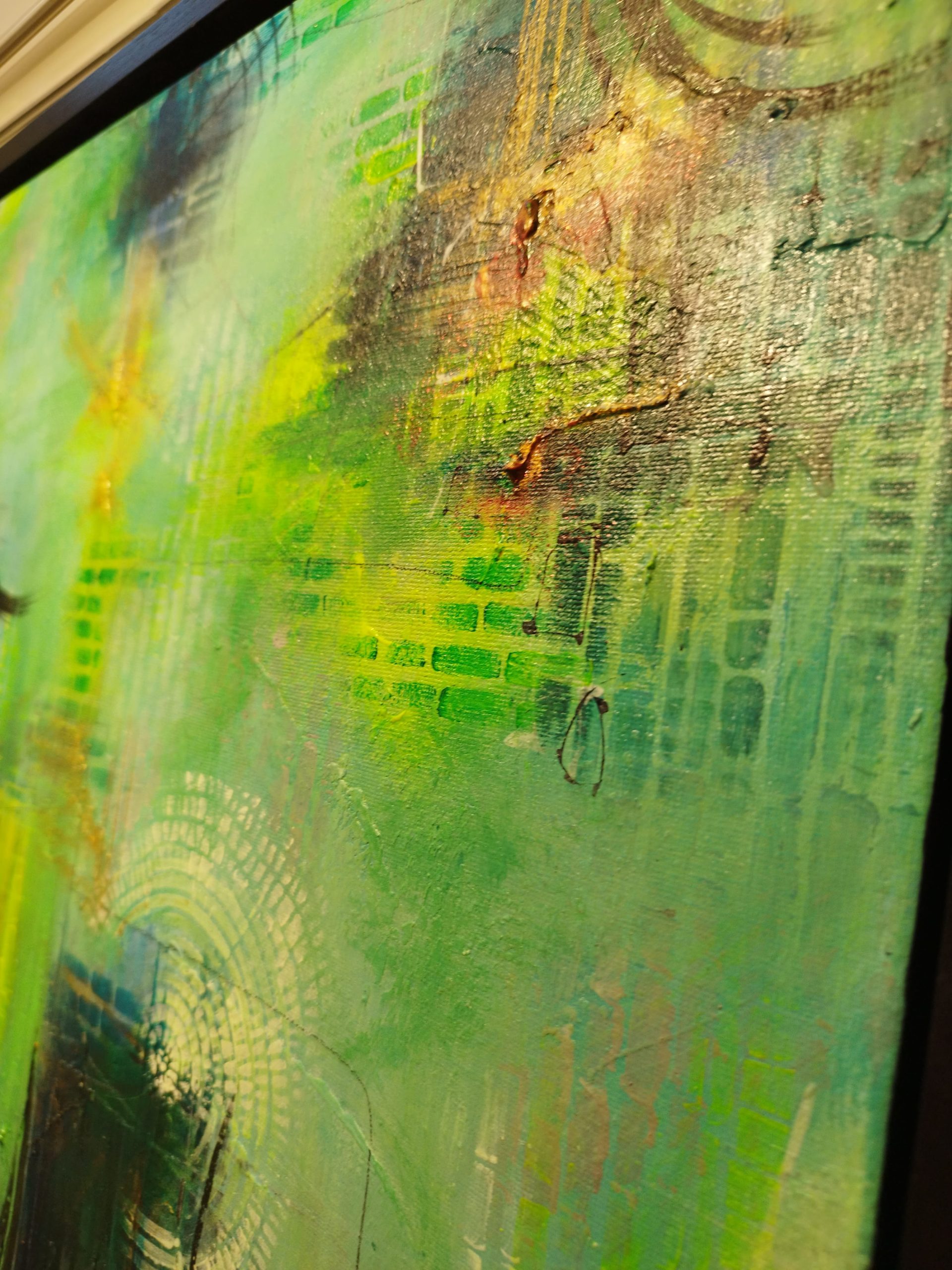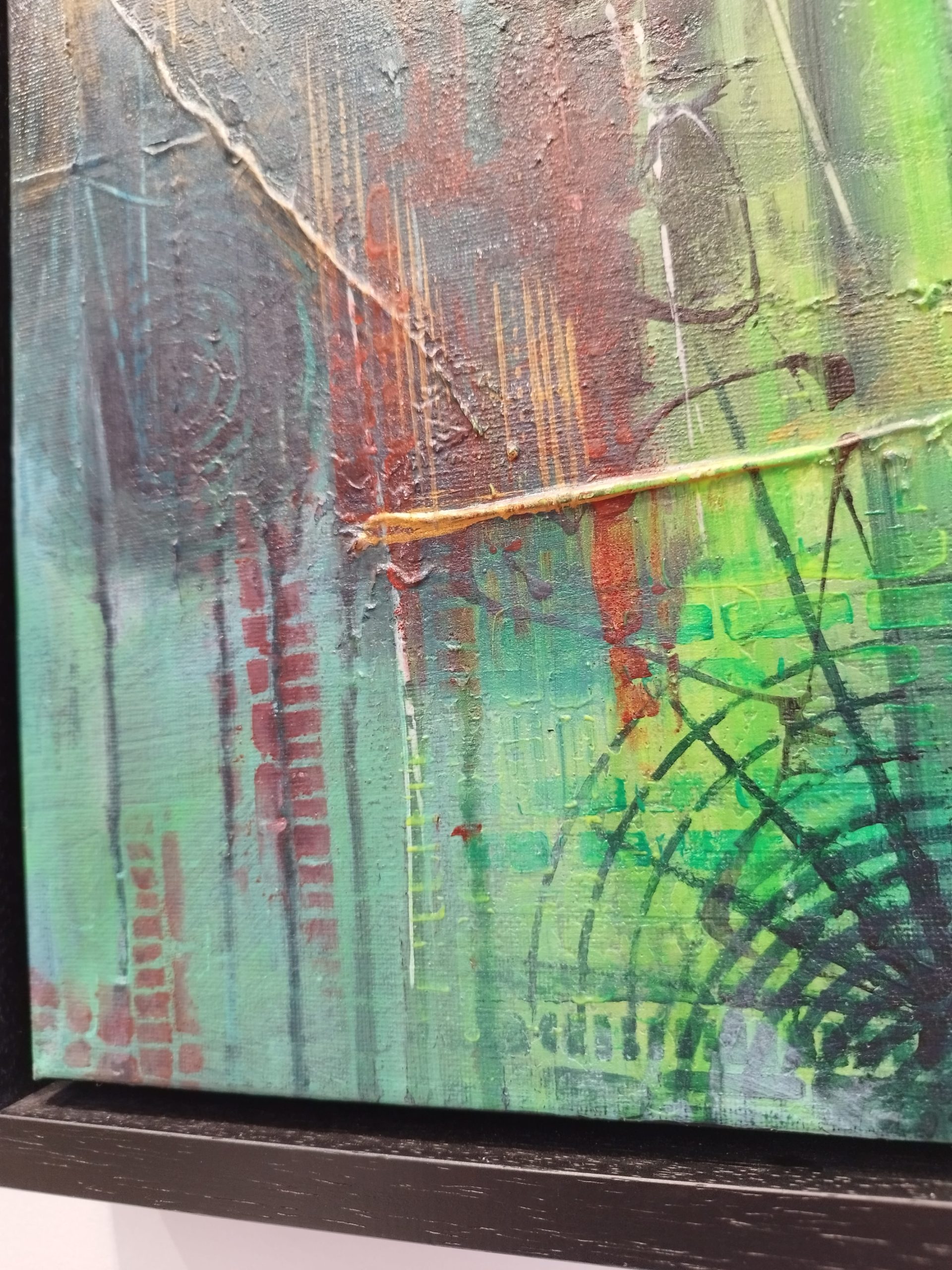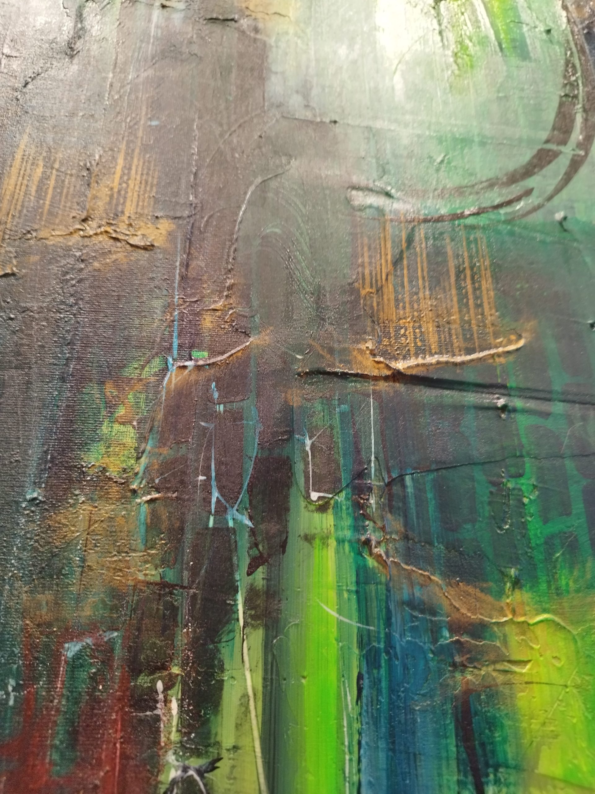 This piece is about the power of dreams – the way scenes shift and change, the intense real-life-like emotions, the presence of people we feel without seeing any faces. The contrast really makes this canvas alive, as the eye registers dark and light shapes in the multiple paint layers. I love all my artworks, but some are harder to let go of – this is one of them.